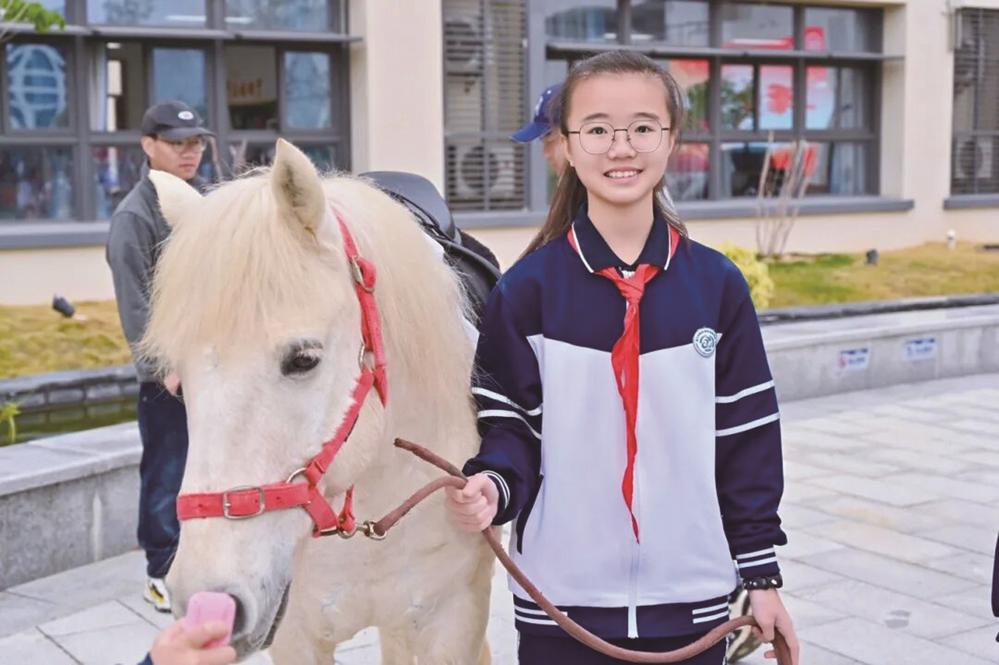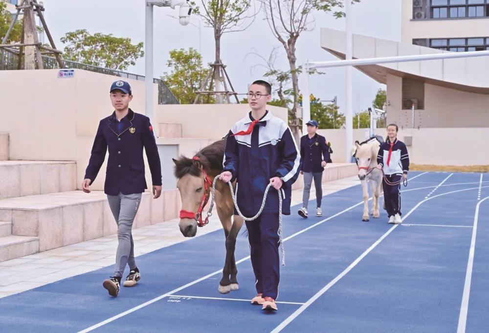 ▲学生牵着骏马进入开学典礼现场。