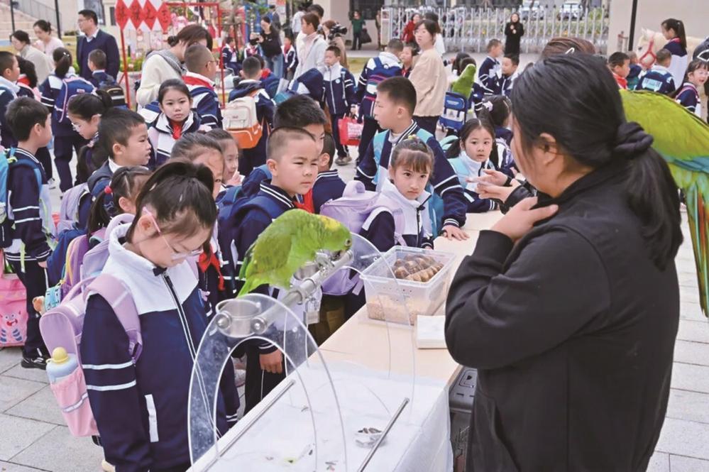 ▲同学们与鹦鹉等萌宠互动。