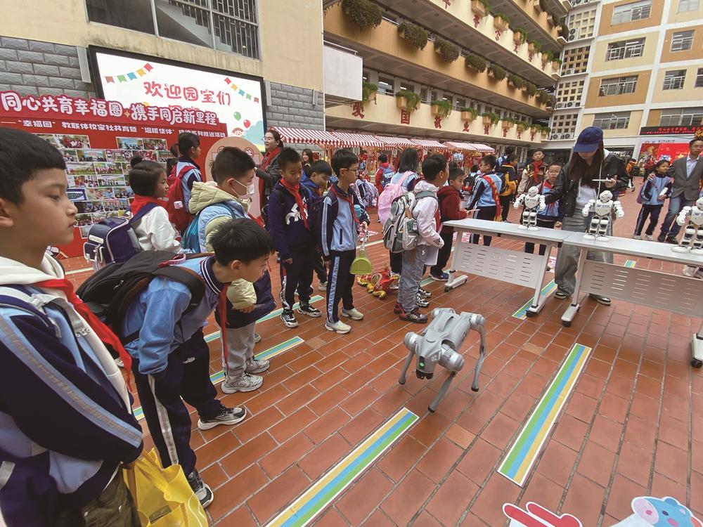 迎接新学期,公园小学校门口暖意融融。昨天一早,老师们亲手为同学们送上“幸福签”,送上新学期最真挚的祝福。呆萌可爱的机器狗与机器人同步上线,灵动起舞欢迎同学们归来,愿大家新学期智慧开花、幸福加码。