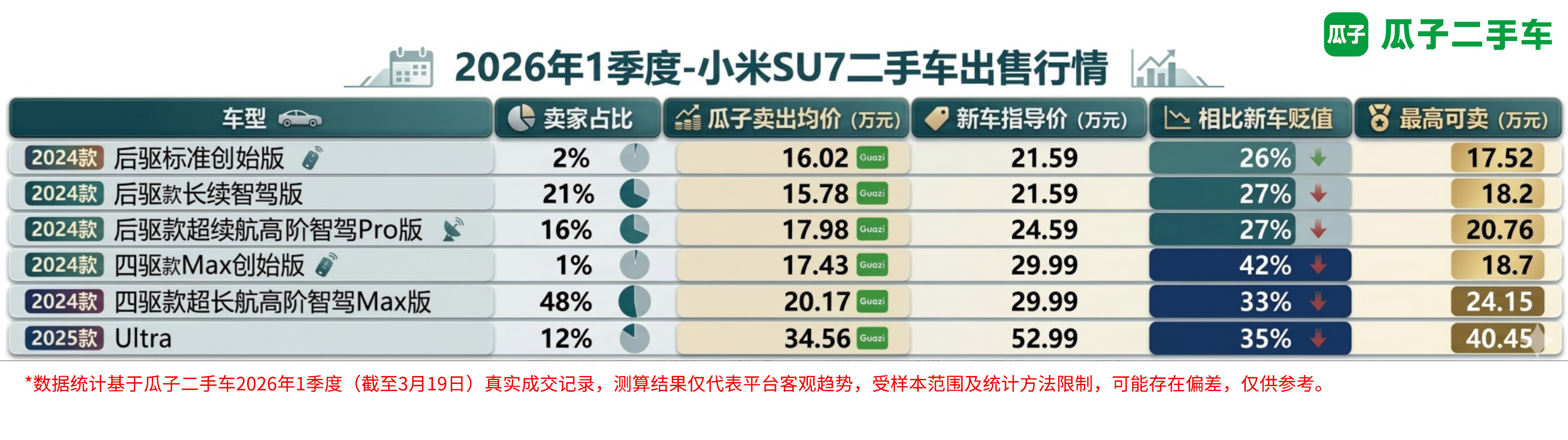 回顾初代SU7上市之初,因产能受限导致的“价格倒挂、加价求车”曾是汽车界的奇景。小米集团创始人、董事长兼CEO雷军在新一代SU7发布会上对新车配置、性能全面升级的描述吸睛无数,而新车上市的背后,初代SU7车主更关心的核心问题也随之而来:爱车的二手保值率是否坚挺?趁新车热潮该如何卖出高价?瓜子二手车基于2026 年一季度真实成交数据,为初代SU7车主揭秘最真实的二手行情。