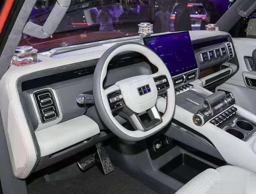 吉利银河战舰的内饰同样可以看到很多硬派越野常用的设计元素,比如副驾前方留有公交车式扶手,副驾驶前方配备了一块屏幕,可以显示方向、车辆姿态、海拔等信息,还有飞机油门杆式的换挡机构等,而内嵌式液晶仪表,大尺寸的悬浮式中控屏让这个硬汉有了几分柔情,官方表示吉利银河战舰将实现全场景AI智能化座舱。