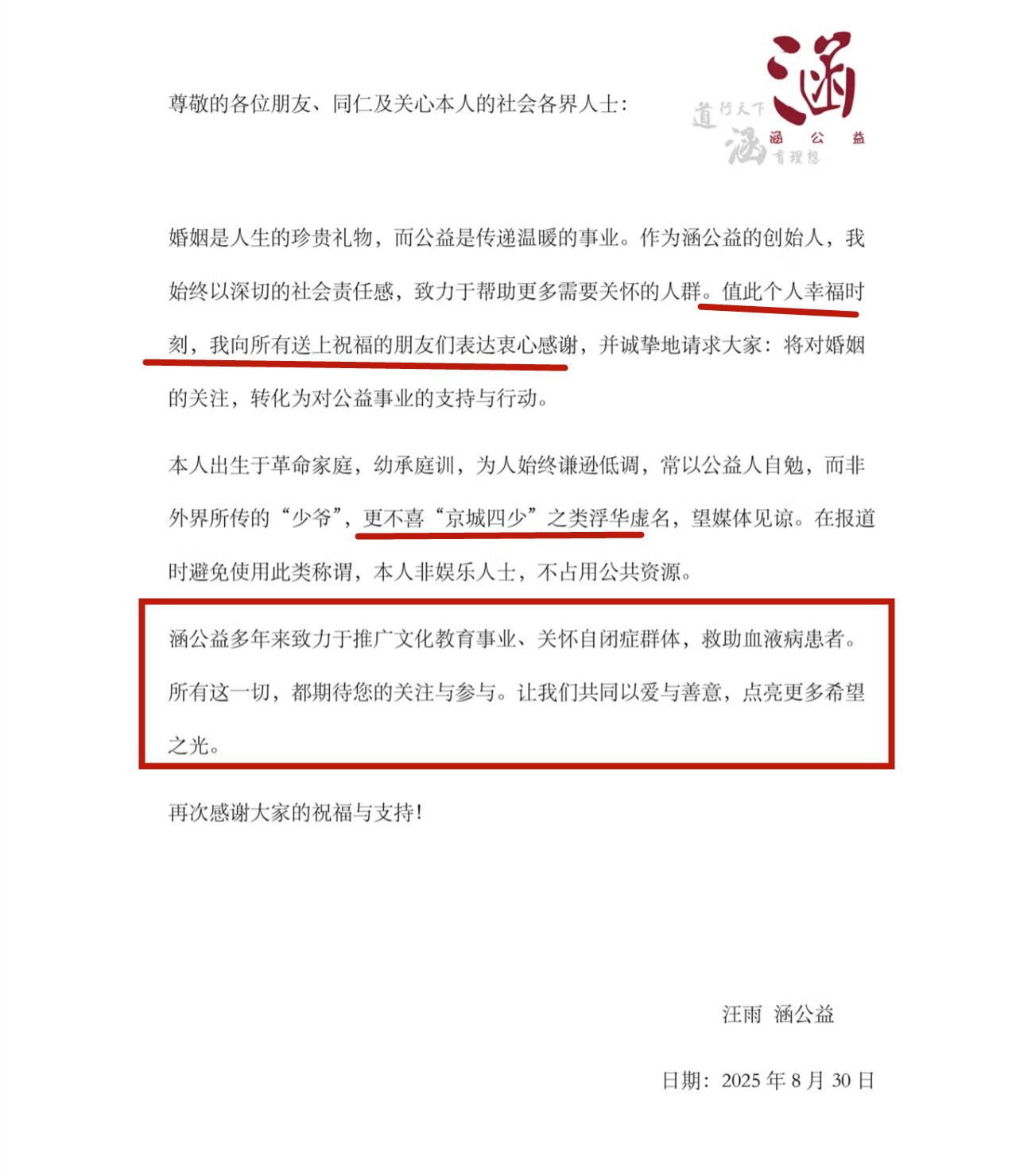 他希望大家将对他婚姻的关注,转化为对公益事业的支持与行动。